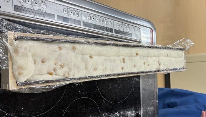「とぼもち」は「かまぼこ」状のながーーーいもちで薄く切って食べます。