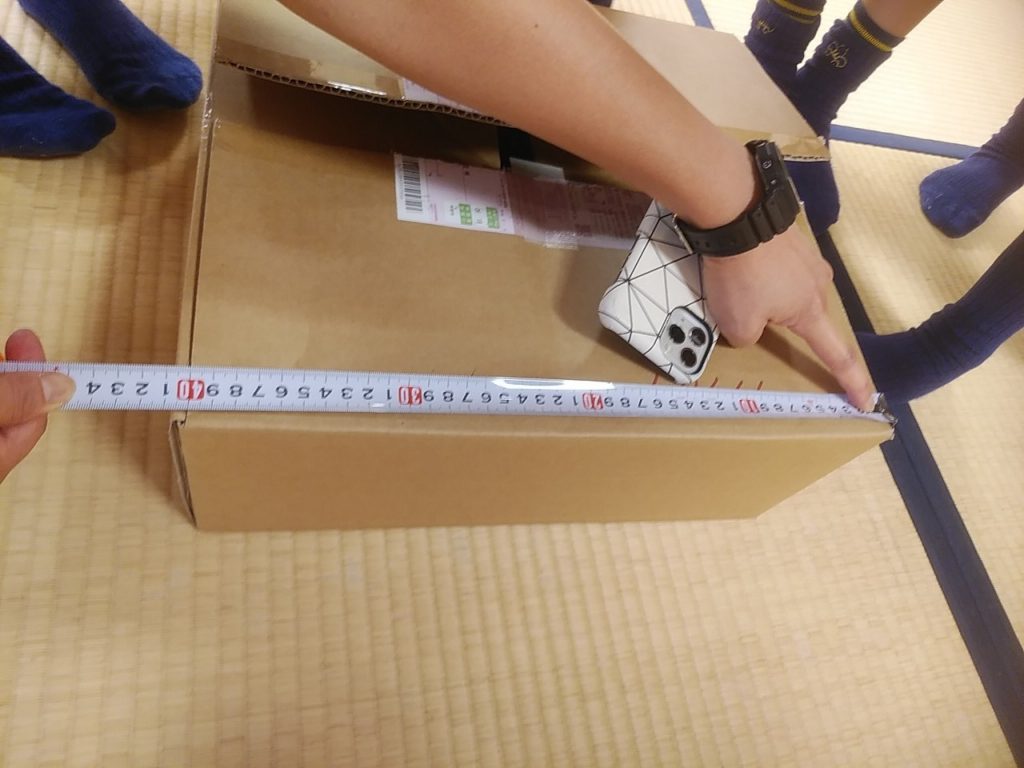 CS隊 隊集会(6/27) カブ隊 2021.06.27 本日、1名新たに入隊し、カブスカウトに仲間入りしました!おめでとう!!今回は春江中コミセンで計測とロープワークを行いました。まず前回の活動で作成した「体の計測メモ」を活用して、箱の長辺の長さ出しをしました。40.7㎝で、五嶋さんがピッタリあてました。次に、近いのが、松川さんの41㎝で、この上位2名が表彰されました。また、チャレンジ章を取得したスカウトにバッジを渡しました。